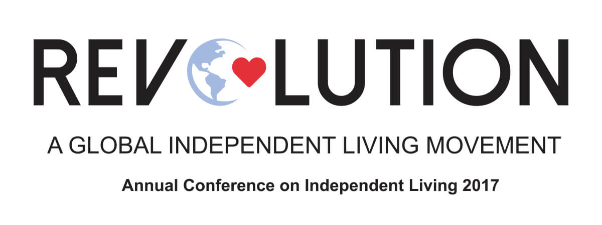 Conference Logo: Revolution - A Global Independent Living Movement - Annual Conference on Independent Living 2017. Graphic: Continents have been added to NCIL's logo (a blue semi-circle), which forms a globe. A red heart sits between the end points of the semi-circle.